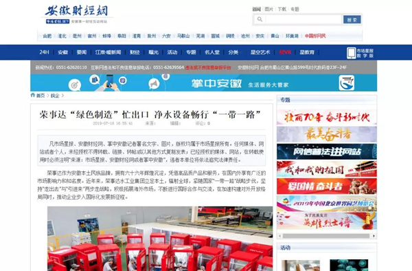 安徽財(cái)經(jīng)網(wǎng) 《榮事達(dá)“綠色制造”忙出口 凈水設(shè)備暢行“一帶一路”》