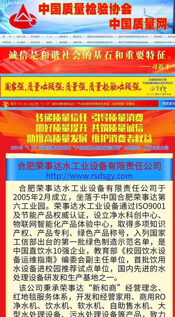 共筑質(zhì)量誠信,引導(dǎo)質(zhì)量消費。在由中國質(zhì)量檢驗協(xié)會主辦的2021年“3.15”產(chǎn)品和服務(wù)質(zhì)量誠信承諾的主題活動中,榮事達憑借卓越的產(chǎn)品品質(zhì)及良好的社會形象,獲得協(xié)會以及權(quán)威專家的一致認可,榮膺 “全國產(chǎn)品和服務(wù)質(zhì)量誠信示范企業(yè)”“全國質(zhì)量信得過產(chǎn)品”“全國凈水行業(yè)質(zhì)量領(lǐng)先品牌” “全國質(zhì)量誠信先進企業(yè)”多項榮譽,《中國質(zhì)量報》、《中國消費者報》及中國質(zhì)量網(wǎng)、中國經(jīng)濟網(wǎng)、中國消費網(wǎng)等多家媒體均予以集中展示和公告。