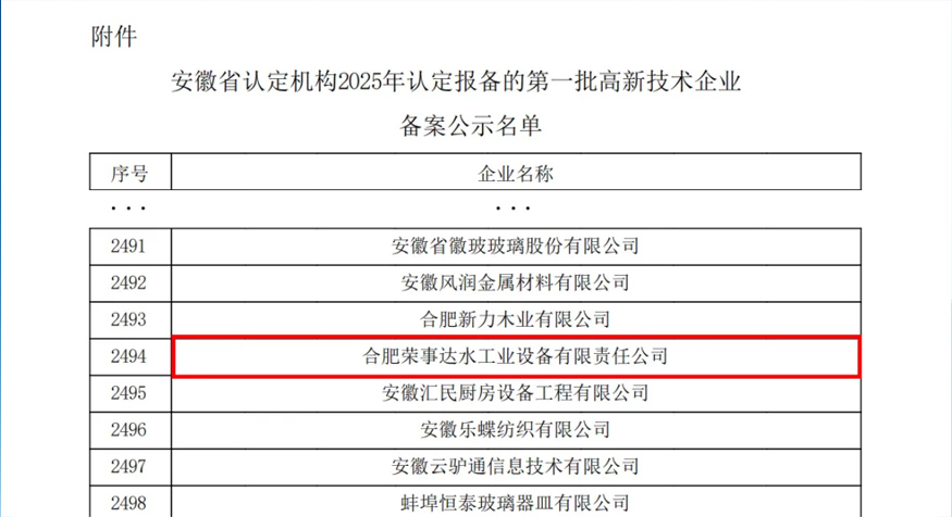 合肥榮事達水工業(yè)設備有限責任公司通過高新技術(shù)企業(yè)認定,榮獲由安徽省工業(yè)和信息化廳、安徽省財政廳、國家稅務總局安徽省稅務局聯(lián)合頒發(fā)的《高新技術(shù)企業(yè)證書》,這一認可,標志著公司在技術(shù)創(chuàng)新、成果轉(zhuǎn)化及核心競爭力建設方面邁上新臺階。